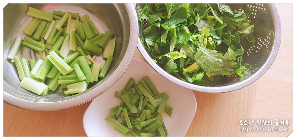 우선 셀러리를 다듬으며 맛을 보니 부위별로 맛이 달랐어요.