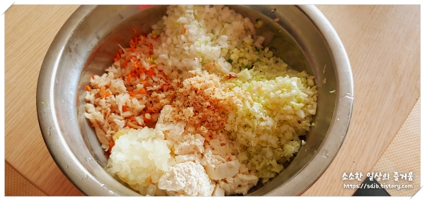 1. 야채와 두부를 다집니다. 물기를 꼭 짜주세요.